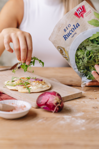 7Bei 240°C Ober- und Unterhitze für ca. 10 Minuten knusprig backen. Danach noch mit frischem Bio-Rucola belegen.
