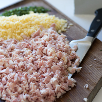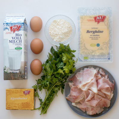 1Die Petersilie, den Bergkäse und den Schinken fein hacken.