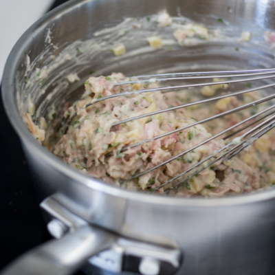2Die Butter in einem Topf schmelzen und das Mehl hinzufügen. Kurz durchrösten, dann nach und nach mit der Milch aufgießen. Dabei ständig mit einem Schneebesen rühren, damit sich keine Klumpen bilden. Hat sich eine dicke, sämige Masse gebildet, den Schinken, Käse und die Petersilie einrühren, mit Salz und Pfeffer abschmecken und beiseite stellen.