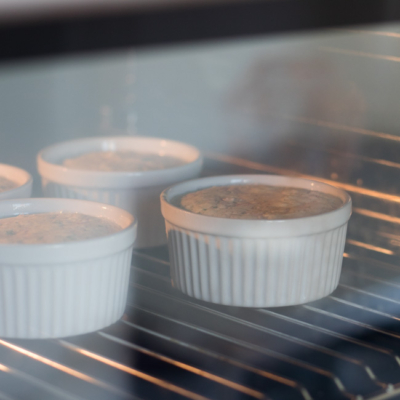 7Bei 180 Grad etwa 30 Minuten backen. Die Ofentür darf dabei keinesfalls geöffnet werden, da die Soufflés sonst zusammenfallen. Sofort servieren und genießen.