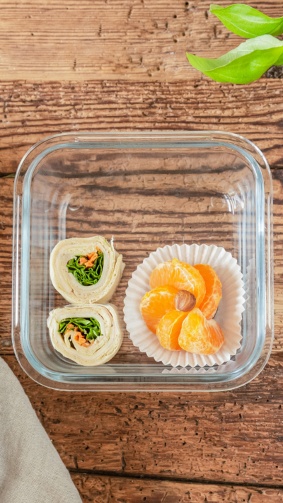3Linsenaufstrich auf die Wraps streichen und mittig mit Schinken, Käse und Salatstreifen belegen, dabei am Rand ca. 1 cm frei lassen.