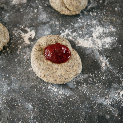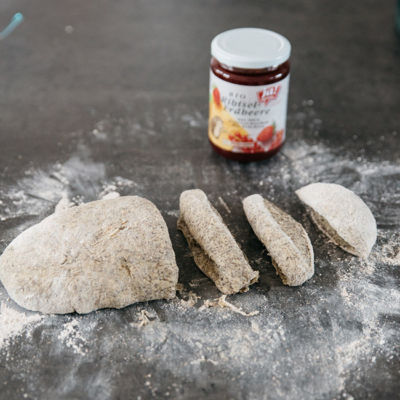 6Die Stücke mit der Hand zu Kreisen flach drücken und mit je einem Esslöffel Ribisel-Erdbeere Fruchtaufstrich füllen. Zu Buchteln formen, gut verschließen und in zerlassender Butter wenden.