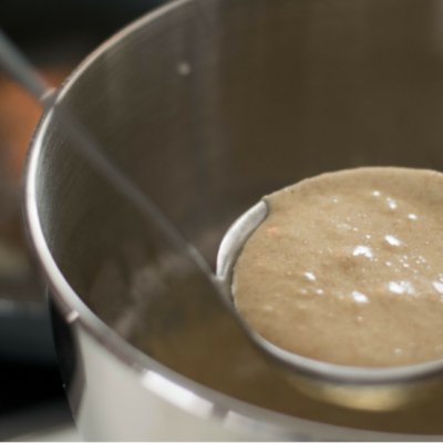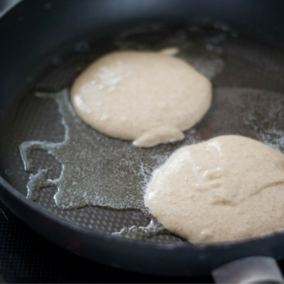 4Teig portionsweise (ein kleiner Schöpfer) hineingeben und zu Kreisen ausformen – es passen meist zwei Kreise in die Pfanne. Bei mittlerer Temperatur so lange braten, bis die Oberseite von Bläschen übersät ist, erst dann wenden.