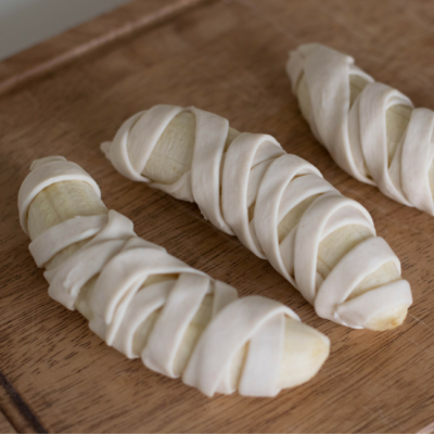5Die Blätterteigstreifen rund um die Bananen wickeln und etwas Platz für die Augen auslassen.