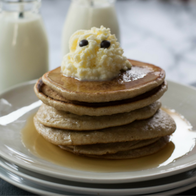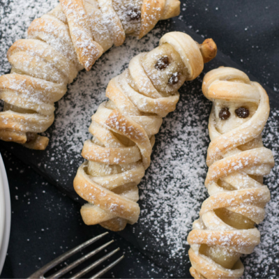 Zu Halloween darf gerne mal ein bisschen ein verrücktes und verkleidetes Frühstück auf den Tisch. So haben sich die Bananen als Mumien verkleidet und die Pancakes kommen als Geister. Gruseliges Frühstücken!