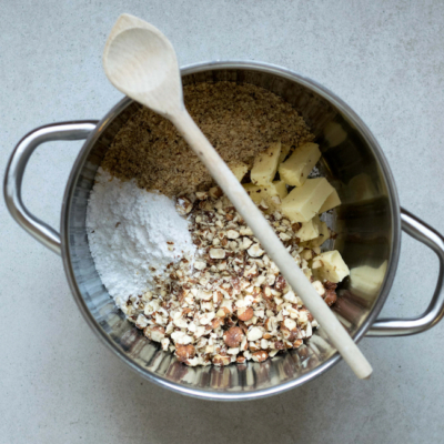 3Für den Belag Butter, Zucker, Vanillezucker und Wasser in einem Topf unter ständigem Rühren zergehen lassen. Dann die gemahlenen und gehackten Haselnüsse untermischen. Anschließend die Masse 15 Minuten abkühlen lassen.
