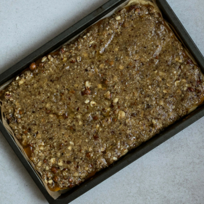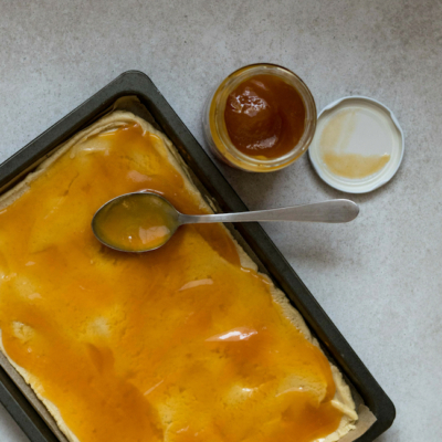 4Den Teig mit Marmelade bestreichen und danach den Nuss-Belag gleichmäßig darauf verteilen und verstreichen.