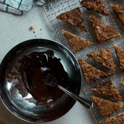 8Die Orangen-Zartbitterschokolade über einem Wasserbad schmelzen. Wer möchte, kann die Ecken der Nussecken hübsch in die Schokolade tunken. Es reicht aber auch Schokolade über die Nussecken zu träufeln. Die Kekse auf einen Kuchenrost und/oder Backpapier legen und den Guss trocknen lassen.