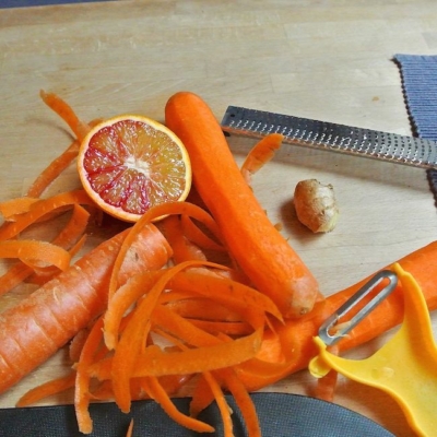 2Von den Orangen die Schale abreibenund auspressen. Für die Suppe brauche ich nur den Saft (die Schale von Bio-Zitrusfrüchten kommen bei mir ins Naturjoghurt, um das Müsli zu aromatisieren!).