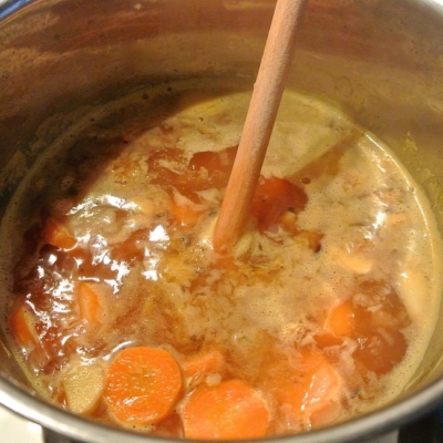 4Mit Suppe und Orangensaft aufgießen und Ingwer und Thymian dazugeben sowie etwas Salz und Pfeffer. Die Suppe ca. 15-20 Minuten auf kleiner Flamme köcheln lassen, bis die Karotten schön weich sind. Dann mit Standmixer oder Pürierstab pürieren.