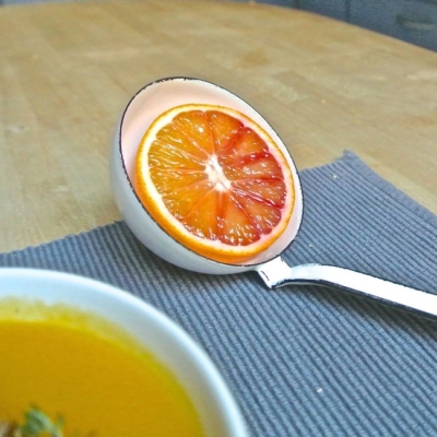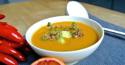 Nachdem seit Tagen gehüstelt wird, hab ich mir gestern einen Einkaufskorb voll Bio-Vitamine geschnappt und fürs Mittagessen eine köstliche Anti-Erkältungssuppe gekocht. Die Zutaten haben Hochsaison und so eine fröhlich farbige und fruchtig frische Suppe macht einfach gute Laune – ganz zu schweigen vom gesunden Vitaminkick. Aktuell gibt es die von mir jedes Jahr heiß ersehnten Moro-Blutorangen – für mich die besten Orangen, die es gibt! Für den nötigen Biss sorgen ein paar selbstgemachte Reiscracker, die ich meist dann mache, wenn mir gekochter Reis übrig geblieben ist. Ein bisschen was Knuspriges kann in einer Suppe nie schaden…