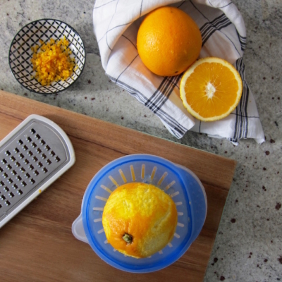 1Eine Orange waschen, trockentupfen und Zesten mit einer Küchenreibe oder einem Zestenreißer abziehen. Beide Orangen halbieren und den Saft auspressen – sollte ca. 200 ml ergeben, ansonsten etwas Wasser hinzugeben.