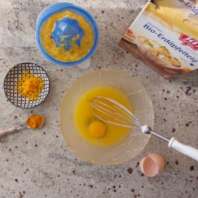 2Ei mit Orangensaft, Zesten, Fruchtfleischresten vom Auspressen und Kurkuma verquirlen.