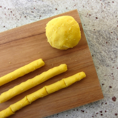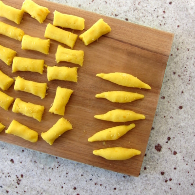 Erdäpfelteig verkneten, mit den Händen zu etwa daumendicken Rollen formen und in ca. 5 cm Stücke schneiden. Stücke zwischen den Händen oder auf einem Brett nach beiden Seiten hin schmäler zu Schupfnudeln rollen. -