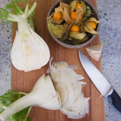 5In der Zwischenzeit Fenchel waschen, halbieren, Strunk ausschneiden und in feine Scheiben schneiden. Fenchelgrün fein hacken. Physalis von Blättern befreien, waschen und halbieren.