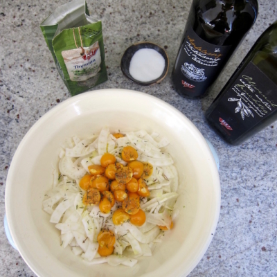 6Fenchel und Physalis mit Olivenöl und Apfelessig marinieren, mit Salz und Thymian abschmecken.