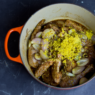 6Den Knoblauch und die Schalotten wieder hinzufügen und das Ganze etwas salzen. Den Ingwer mit Hilfe einer Reibe dazureiben. Falls nötig noch etwas Wasser hinzufügen, das Geflügel sollte bedeckt sein.