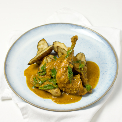 Ich muss zugeben, dass dieses Gericht der erste Gockel für mich war. Prinzipiell kommt Geflügel bei mir eher selten auf den Tisch, aber ich bin sehr froh den Gockel ausprobiert zu haben. Den wird es in Zukunft sicher öfters geben. Ich habe daraus ein schönes Schmorgericht mit orientalischen Gewürzen wie Harissa und Koriandersamen gezaubert. Das Fleisch war sehr saftig, weich und geschmacksvoll, sogar die Brust von der ich normalerweise kein Fan bin. Die Soße war schön scharf mit einer Ingwernote und sämig, süß durch die Schalotten. Dazu gab es Topinambur, einer meiner Lieblinge im Winter. Ich mag die fast speckige Rauchnote sehr. Ich finde der Geschmack ist einmalig und bei fast keinem anderen Gemüse zu finden. Ich habe ihn ganz simpel mit der Schale im Ofen zubereitet.
