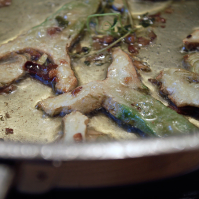 7Den Bauchspeck fein hacken. In einer Pfanne mit heißem Olivenöl, einer ganzen Knoblauchzehe (mehrmals mit dem Messer in die Knoblauchzehe stechen) und etwas frischem Thymian den Bauchspeck für mehrere Minuten leicht anbraten. Den knusprigen Speck aus der Pfanne nehmen und die Schüssel mit Zitronensaft und Parmesan geben. Das Olivenöl mit Knoblauch und Thymian weiterverwenden und die Artischocken darin anbraten, bis sie goldbraun sind.