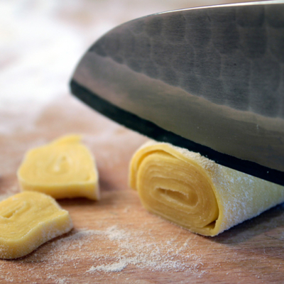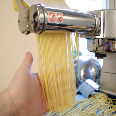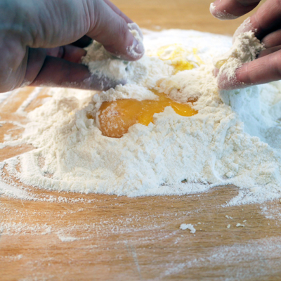 Den Teig mit dem Nudelholz sehr dünn ausrollen, zirka 1 mm dick. Zum leichteren Arbeiten zusätzliches Mehl verwenden. Den langen Nudelteig wie eine Zigarre zusammenrollen, mit dem Messer kleine Stücke (Spaghetti 1mm, Trenette 3 mm, Tagliatelle 7mm) von der Rolle abschneiden. Danach die Pasta auseinanderrollen, sorgfältig auf einem Blech auflegen und trocknen lassen.