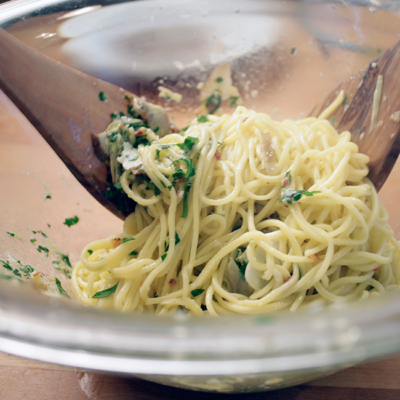 11Die gekochten Artischockenblätter in etwas Vinaigrette tauchen und mit der Pasta servieren. Zum Essen, Artischockenblätter mit dem breiten unteren Ende in den Mund nehmen und das Fruchtfleisch aussaugen.