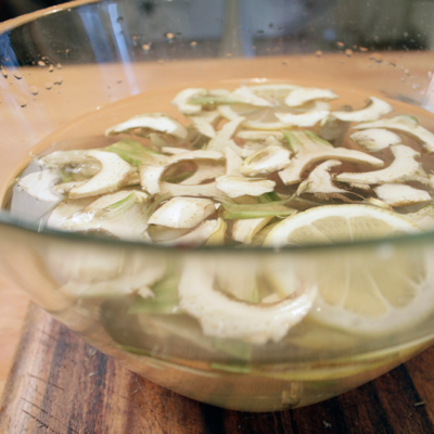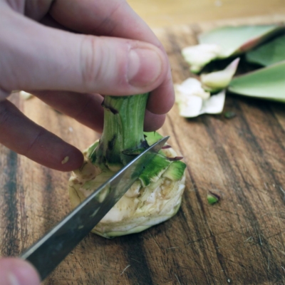 4Eine große Schüssel mit kaltem Wasser bereitstellen, einige Scheiben Zitrone und etwas Zitronensaft zum Wasser geben, das verhindert das „braun“ werden. Als erstes die äußeren 1-2 Blätterschichten von Hand abzupfen und aufbewahren.