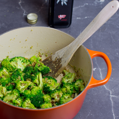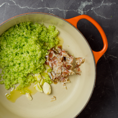 3In einem Topf mit reichlich Olivenöl, den Speck, den Stiel und den Knoblauch für ca. 10 Minuten bei mittlerer Temperatur andünsten. Danach Brokkolirösschen noch etwas kleiner schneiden, ebenfalls in den Topf geben, etwas salzen und für zusätzliche 5 Minuten mitrösten.