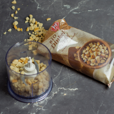 4In der Zwischenzeit die Semmelwürfel in ein Küchentuch geben, verschließen und mit einem Fleischklopfer oder Nudelholz die Wüfel zerkleinern. Falls man eine Küchenmaschine oder Ähnliches zur Verfügung hat, geht es so natürlich einfacher.