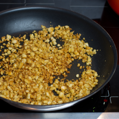 5In einer Pfanne mit reichlich Olivenöl das Brot knusprig, goldbraun anbraten und beiseite legen.