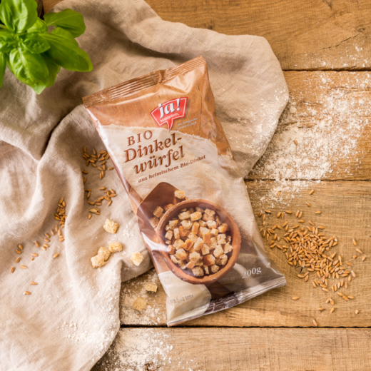 Die neuen Ja! Natürlich Dinkel-Würfel sind eine neue Alternative zu herkömmlichen Semmelwürfeln. Sie werden speziell für Ja! Natürlich aus frisch gebackenem Dinkelbrot hergestellt. Der Bio-Dinkel wird ausschließlich von unseren Vertragsbauern in den traditionellen österreichischen Getreideanbaugebieten im Waldviertel, Weinviertel und Burgenland angebaut. Wie alle Ja! Natürlich Produkte selbstverständlich palmölfrei.