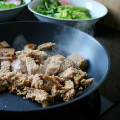 5Die Brotscheiben in Würfel schneiden und in einer Pfanne mit etwas Öl knusprig braten.