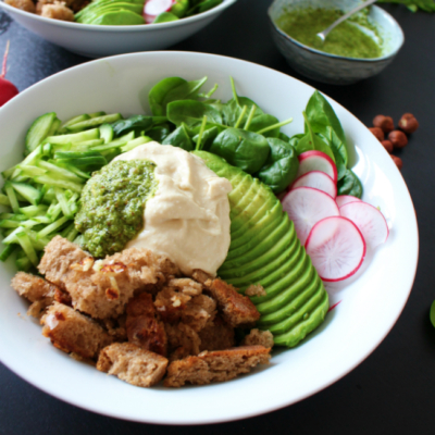 6Das Pesto, die knusprigen Brotwürfel und den Humus auf dem Salat verteilen. Fertig ist eure knackige Frühstücks-Bowl!