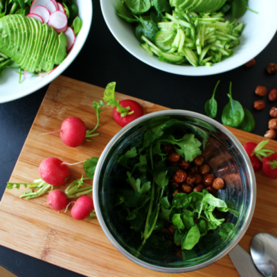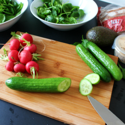 3Blattspinat bzw. Salat waschen, auf den Teller legen und Radieschen, Gurke und Avocado dazu geben.