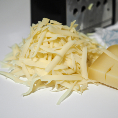 4Den Käse grob reiben, das Mehl mit Backpulver und Natron versieben.