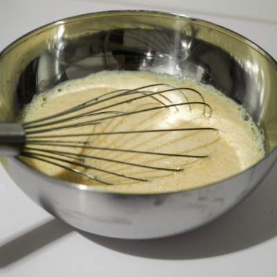 5Das Ei mit dem Schneebesen kurz aufschlagen, dann das Bier, Butter und den Käse untermengen.