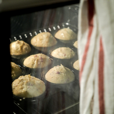 8Ein 12-er Muffinblech befetten und bemehlen, dann den Teig portionsweise in die Förmchen füllen. Bei 200 °C etwa 20 Minuten backen, dann auskühlen lassen.