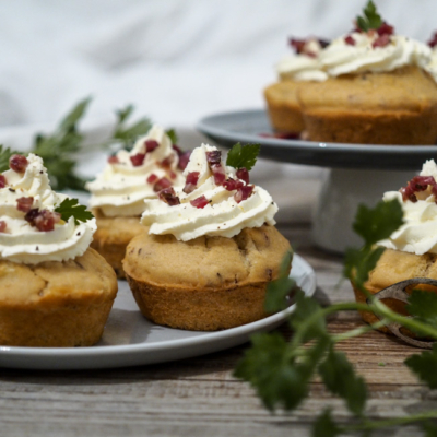 Diese Cupcakes sind perfide Gesellen: Sie sehen mit ihrem weißen Häubchen aus wie klassisch süße Sünden, beißt man dann in den saftigen Teig mit dem cremigen Topping, so merkt man jedoch schnell, das man es hier mit etwas ziemlich Pikanten zu tun hat. Speck, Bergkäse und Kümmel machen den Teigboden richtig schön würzig und das geschmeidige Frischkäse-Häubchen setzt dem Muffin die verdiente Krone auf. Ideal also, wenn man selbst keine besonders „süße“ Zeitgenossin ist, oder einem Torten-Verweigerer eine Geburtstagsüberraschung aus dem Ofen holen soll. Ich kann versprechen: Mit einem kräftigen Schuss Bier und krossen Bio-Speckwürfeln konvertieren diese Cupcakes auch den größten Kuchenmuffel zum Backwerk-Fanatiker. Wurde getestet, war erfolgreich und wird jetzt der Welt erzählt – mit einem Rezept, das auch Backanfängern gut gelingt.