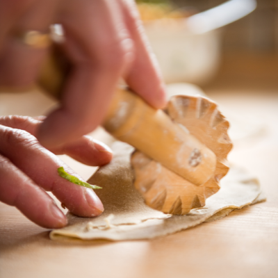 5Die ausgewalkten Kreise auf dem Brett auslegen, mit der vorbereiteten Fülle belegen, zusammenklappen und gut verschließen. Mit dem „Krapfenradl“ radeln. Hat man kein solches Radl, den Rand mit der Gaber schmal niederdrücken.