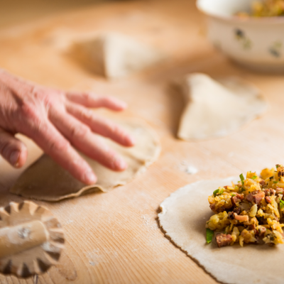 - Möglichkeiten für die Füllung: Erdäpfelgröstl mit Sauerkraut oder geriebener Apfel mit Preiselbeermarmelade und Zimt.