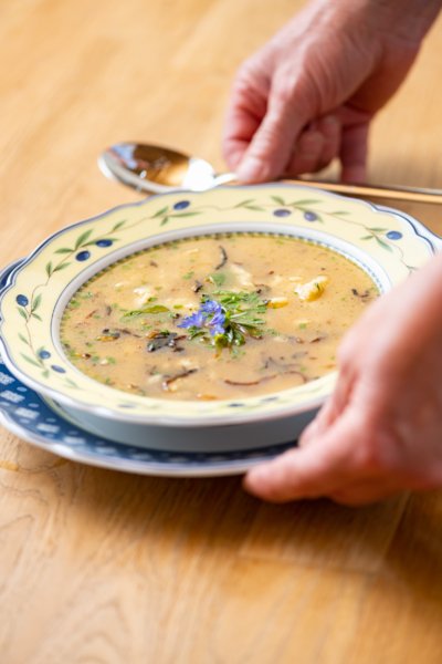5Danach gibt man sie in die kochende Suppe und streut den geschnittenen Käse dazu. Die Suppe kurz ziehen lassen, nicht mehr kochen. Nachwürzen