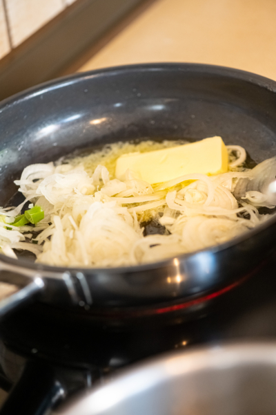Während die Suppe gut durchzieht , die Zwiebel in feine Ringe schneiden und in Butter anbräunen. Das Ganze über die Suppe gießen und mit Schnittlauch bestreuen.