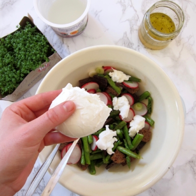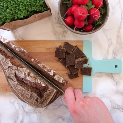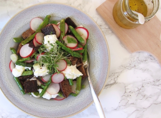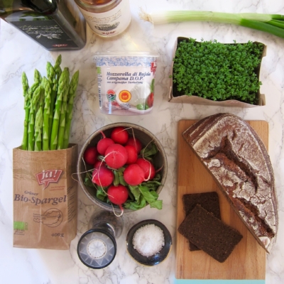 Das Radieschenbrot ist Stammgast am Frühstückstisch und Sinnbild dafür, dass die einfachsten Kombinationen oft die köstlichsten sind. Zuerst macht uns das Farbenspiel von Pink und Weiß – im Idealfall gekoppelt mit etwas frischem Grün – auf dem sattem Braun eines reschen Bauernbrots schöne Augen, dann sorgt das Knacken der Radieschen gepaart mit der würzigen Schärfe der enthaltenen Senföle für Liebe auf den ersten leicht salzigen Biss. Warum nicht auch in der Mittagspause oder beim Brunch eine frühlingshafte Brotzeit einlegen? Bei mir kommt das Radieschenbrot diesmal „deconstructed“ auf den Teller – als knackfrischer Brotsalat mit gebratenem Spargel, herrlich milchigem Mozzarella und Kresse. In Sachen Brot ist erlaubt, was schmeckt. Roggenbrot sorgt für einen herzhaften Geschmack. Süß-malziges Pumpernickel eignet sich gut, um die leichte Schärfe der Radieschen auszugleichen. Beides zusammen ist unschlagbar. Und weil die Radieschen im Seewinkel frei von künstlichen Spritzmitteln und Dünger angebaut werden, dürfen auch ihre aromatischen Blätter als Kräuteralternative mitspielen.
