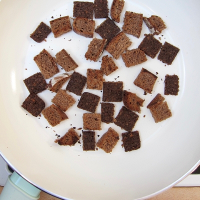 1Das Brot in ca. Radieschen-große Würfel schneiden und in einer Pfanne ohne Öl knusprig rösten.