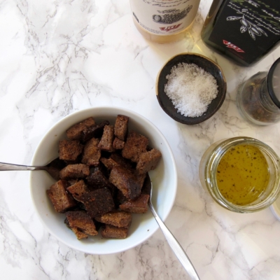 3Die knusprigen Brotwürfel in einer Schüssel mit etwas Dressing übergießen, mit zwei Löffeln gut vermengen und das Brot beiseitestellen, damit es die würzige Flüssigkeit aufnehmen kann.