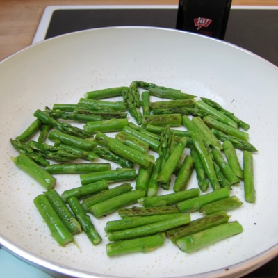 5Spargelstücke in der Pfanne mit 1 EL Olivenöl ca. 4 Minuten anbraten, dazwischen rütteln – der Spargel sollte bissfest bleiben.