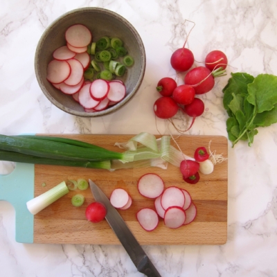 6Radieschen, Frühlingszwiebel und ein paar zarte Radieschenblätter waschen. Radieschen in dünne Scheiben und Frühlingszwiebel in Ringe schneiden, Radieschenblätter mit den Fingern reißen und schneiden.