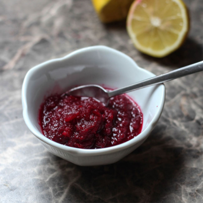 2Einen TL Zitronensaft zu den Rüben geben und diese fein pürieren – die Zitrone hilft dabei, dass die roten Rüben die schöne purpurne Farbe behalten.