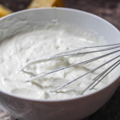6Währenddessen Topfen, Sauerrahm, Zitronenschale und -saft sowie Zucker mit einem Schneebesen zu einer glatten Crème vermengen.