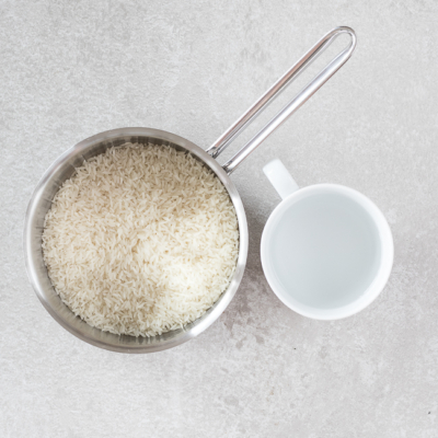 2Reis in ein feinmaschiges Sieb geben und mit Wasser abspülen. Gemeinsam mit der doppelten Menge Wasser in einen Kochtopf geben und aufkochen lassen. Die Temperatur reduzieren und weitere 15 Minuten köcheln lassen.