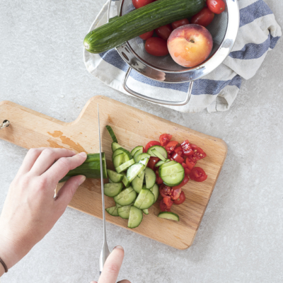 3In der Zwischenzeit das Obst und Gemüse waschen. Die Tomaten, Gurken und den Pfirsich in kleine Würfel schneiden.